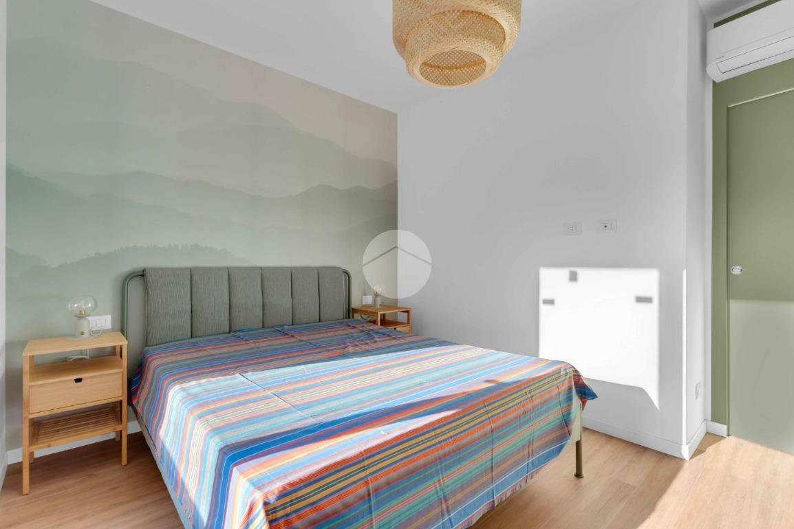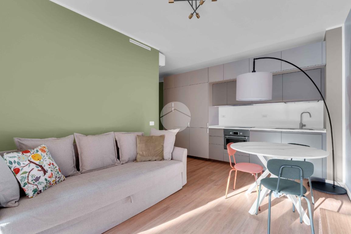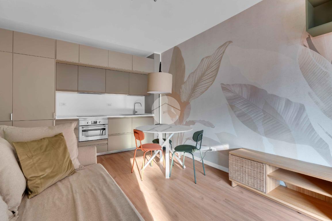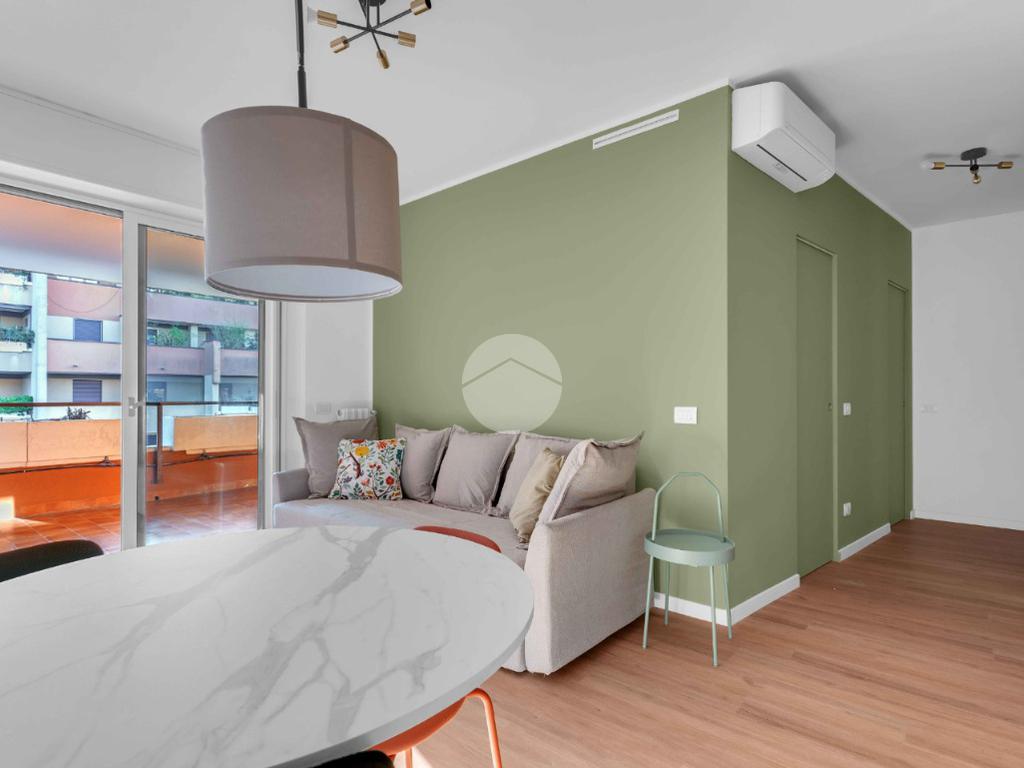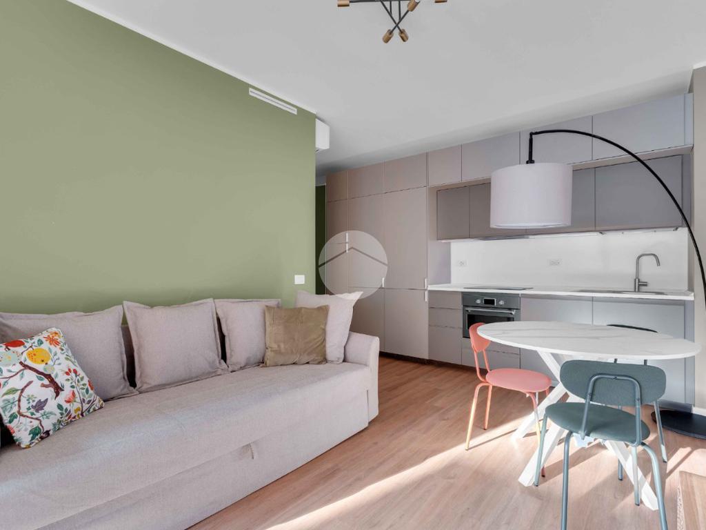 L’ingresso si apre su un luminoso soggiorno con cucina a vista, uno spazio pensato per vivere: cene con gli amici, colazioni lente o semplicemente un momento di relax dopo una lunga giornata. Il terrazzo loggiato, affacciato sul silenzio e sul verde, diventa una vera estensione della casa, perfetto in ogni stagione.