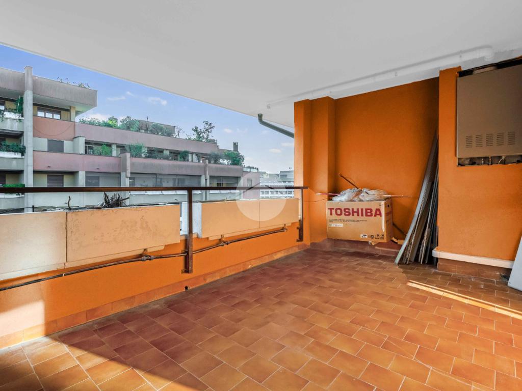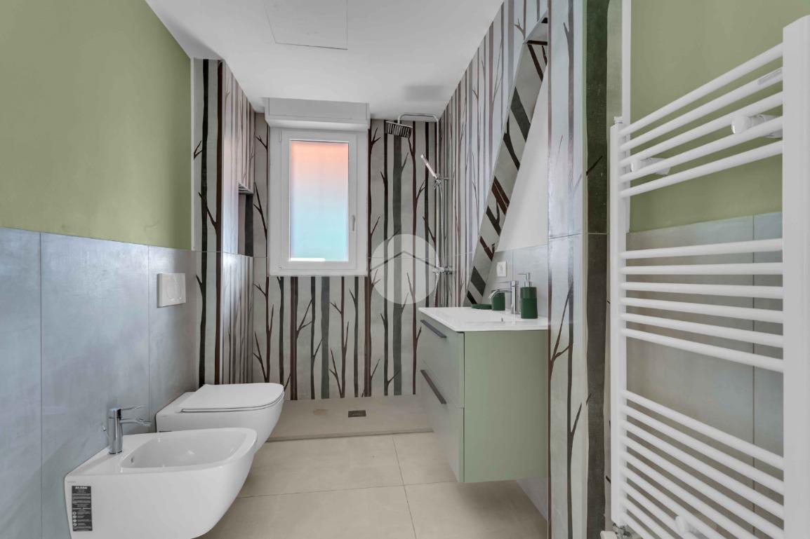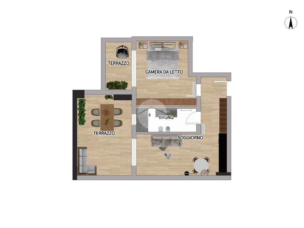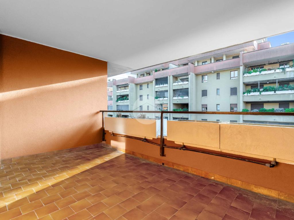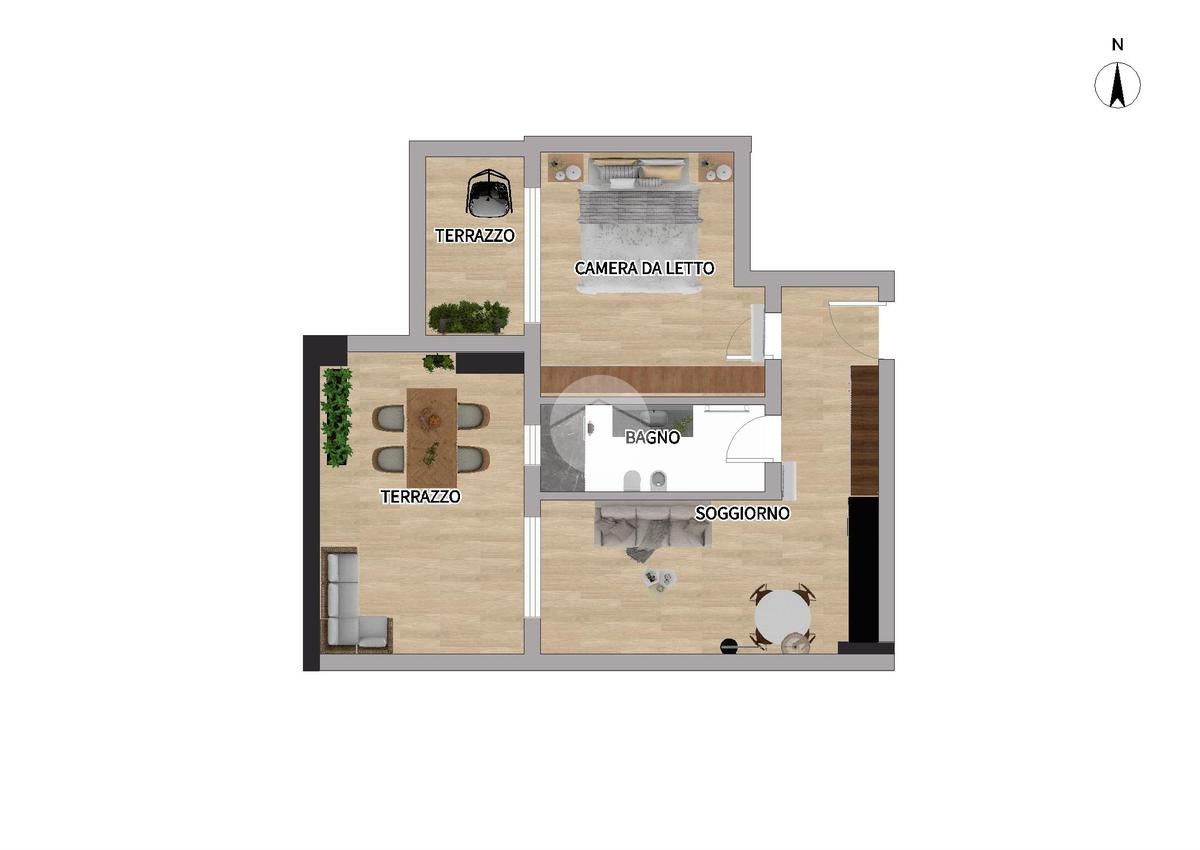 L’ingresso si apre su un luminoso soggiorno con cucina a vista, uno spazio pensato per vivere: cene con gli amici, colazioni lente o semplicemente un momento di relax dopo una lunga giornata. Il terrazzo loggiato, affacciato sul silenzio e sul verde, diventa una vera estensione della casa, perfetto in ogni stagione.