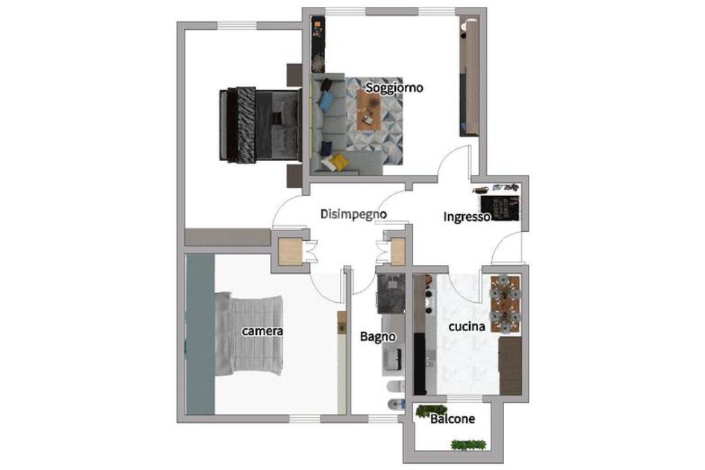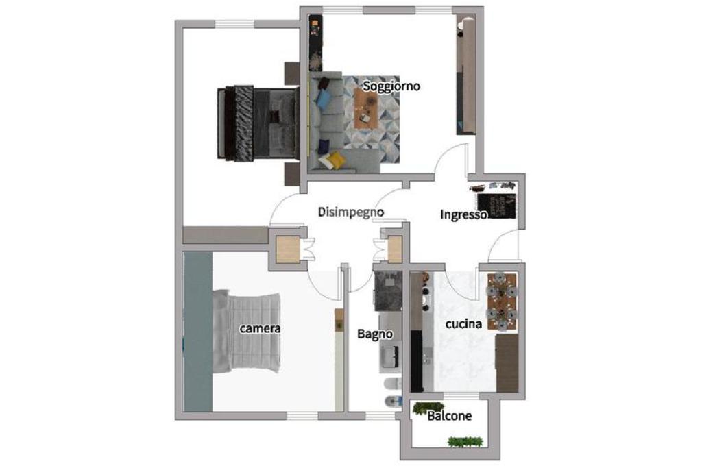 La cucina abitabile, moderna e funzionale, dispone di accesso al balcone, ideale per momenti di relax. Un disimpegno separa la zona giorno dalla zona notte, garantendo privacy e indipendenza. Le due camere da letto, una matrimoniale e una singola, offrono spazi accoglienti e sono perfette per il riposo, lo studio o lo smart working. Il bagno, recentemente ristrutturato, finestrato e dotato di doccia completa la casa con praticità e comfort.