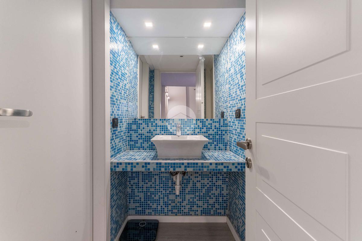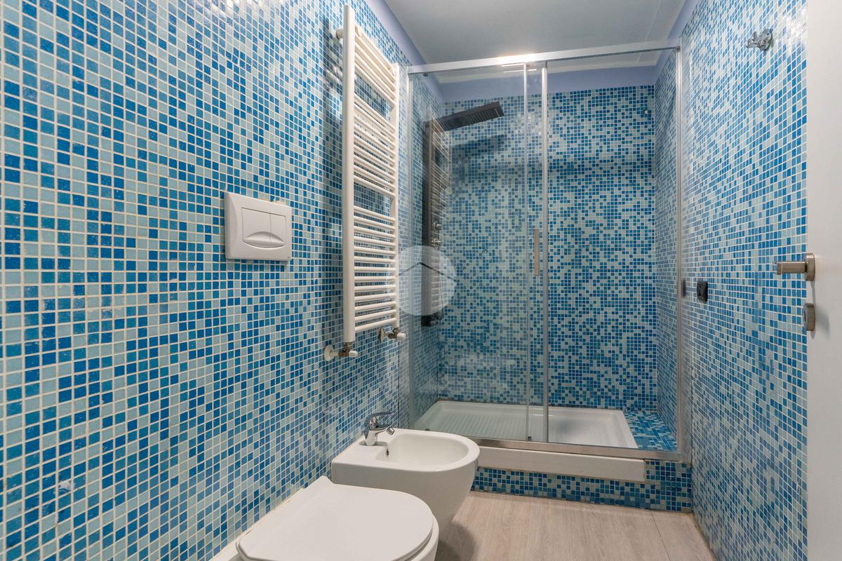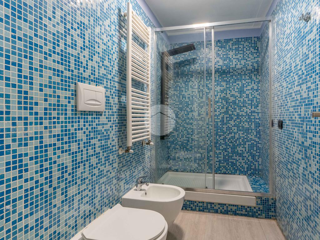 Completano la soluzione, un bagno con rivestimenti in stile Bisazza e dotato di doccia multifunzionale ed un'ampia lavanderia/ripostiglio.