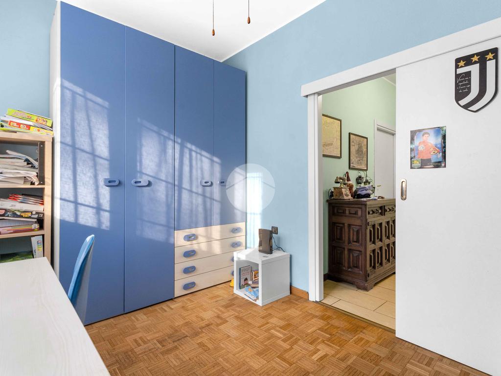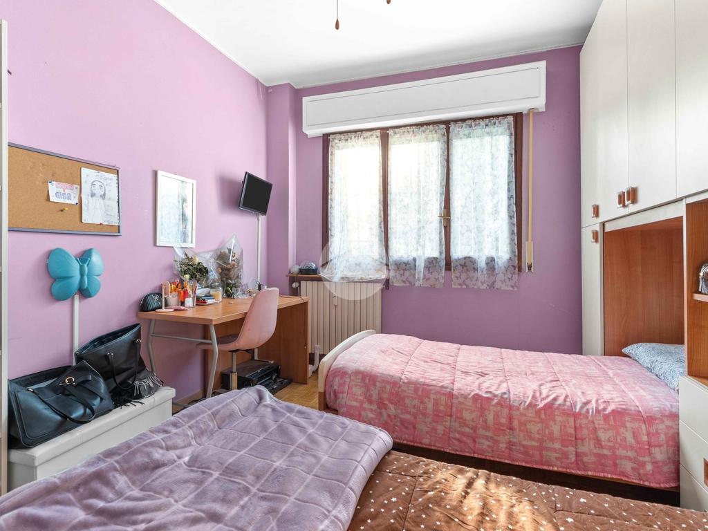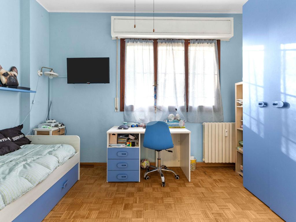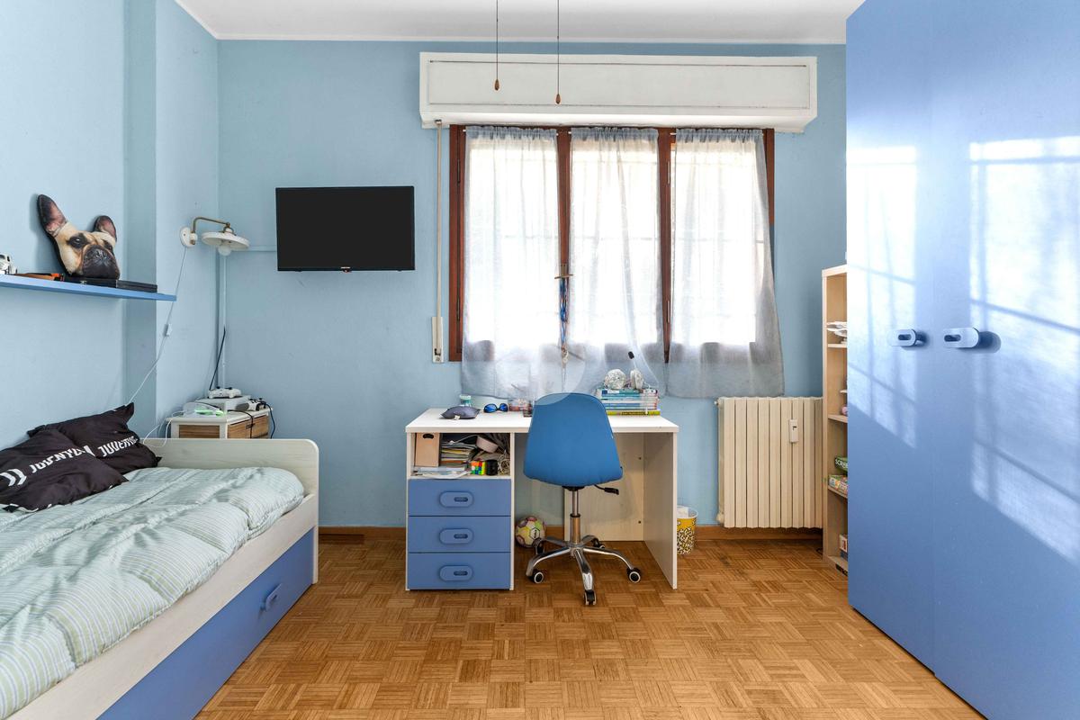 Sempre dall’ingresso si raggiunge una prima stanza versatile, ideale come cameretta o studio, caratterizzata da un piacevole affaccio sul verde condominiale: la soluzione perfetta per chi lavora da casa e desidera uno spazio riservato, tranquillo e funzionale.