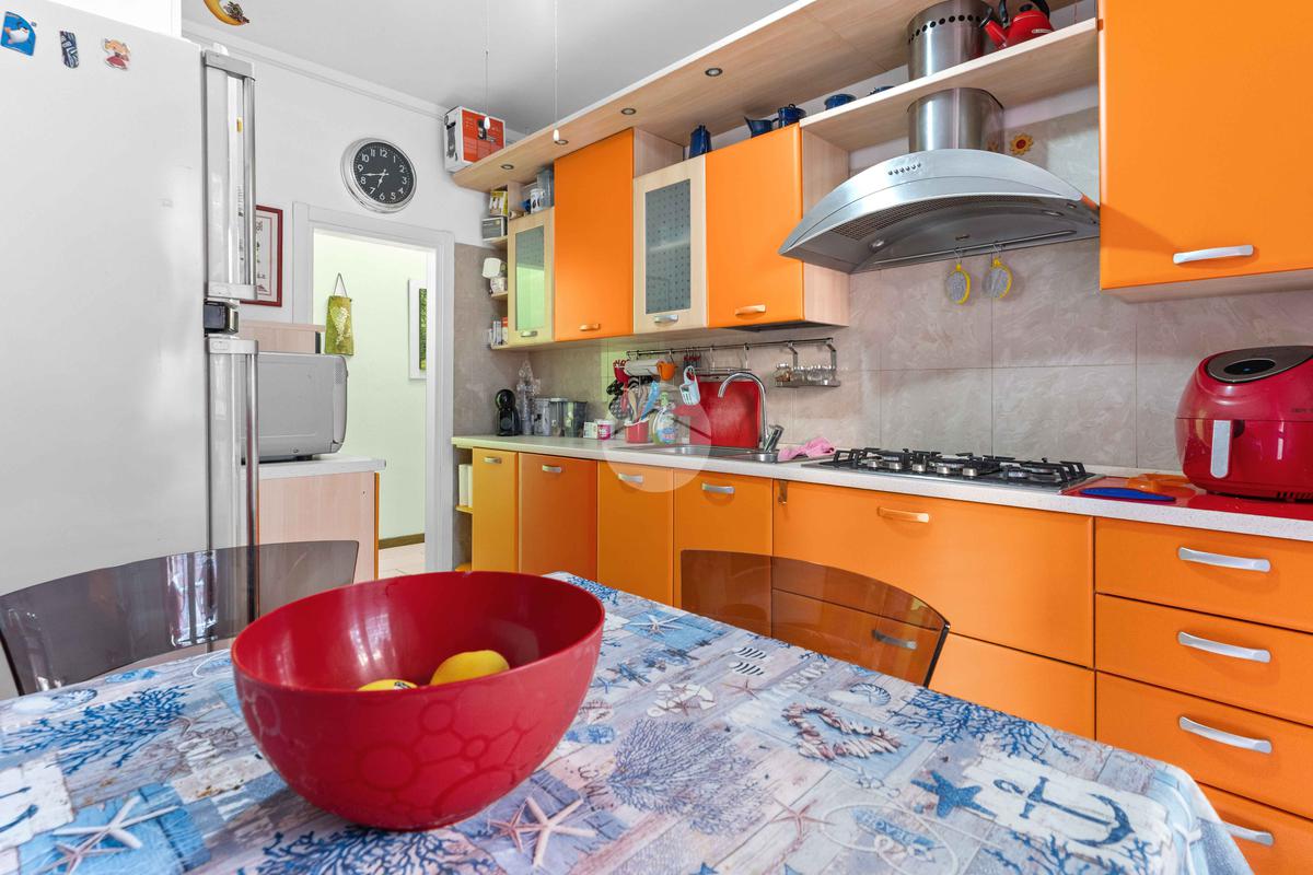 Dall’ingresso si accede alle diverse aree della casa. L’ampio soggiorno, cuore pulsante dell’abitazione, è impreziosito da una calda pavimentazione in parquet che dona carattere ed eleganza agli ambienti. La cucina abitabile, accogliente e funzionale, si apre sul balcone tramite una porta finestra, creando un naturale dialogo tra interno ed esterno.